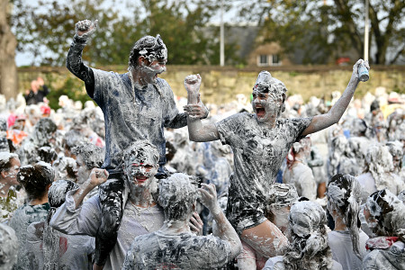 20日、英北部スコットランドのセントアンドルーズ大学で、新入生を歓迎する恒例のイベント「レーズンマンデー泡合戦」に参加し、全身が泡まみれになった学生たち。 【AFP時事】