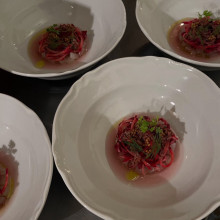 コンセプトは「上質な日常」。丹さんは「ぜいたくな食事とリーズナブルな食事に二極化する中、その間にある『丁寧な日常の食事』を提供したい」と話す。メニューは、金曜・土曜・日曜の予約客にはコース(4,500円=4~5皿、6,500円=6~7皿)のみを提供。予約なしの客にはアラカルトを提供する。平日はアラカルトを中心とし、予約なしの来店にも対応する。